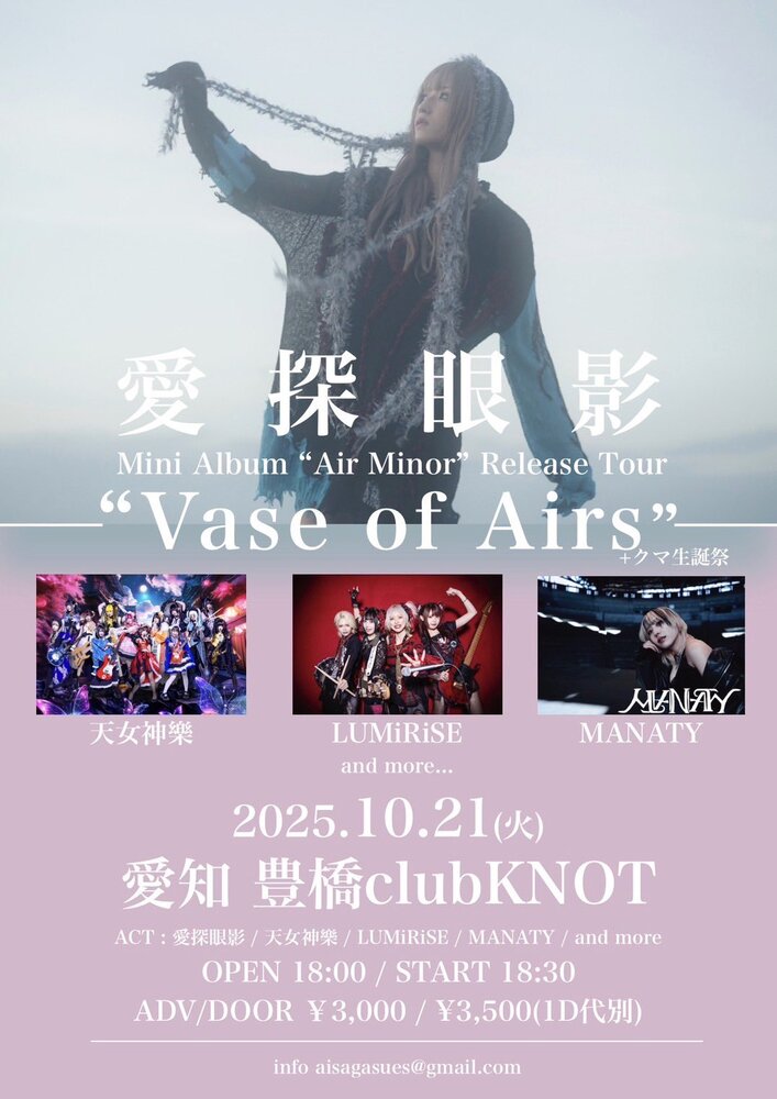 愛探眼影“AIR MINOR”Relese Tour “Vase of Airs” SCHEDULE 2025/10/21(火) 豊橋clubKNOT 18:00/18:30 ¥3,000/¥3,500-(1D別) チケットリンク URLをコピーする 報告する