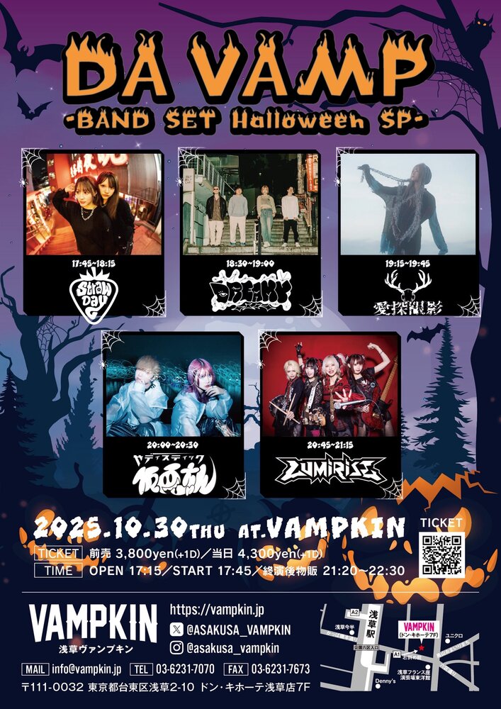 DA VAMP-BAND SET Halloween SP- SCHEDULE 2025/10/30(木) 浅草ヴァンプキン 17:15/17:45 ¥3,800/¥4,300(+1D代) チケットリンク URLをコピーする 報告する