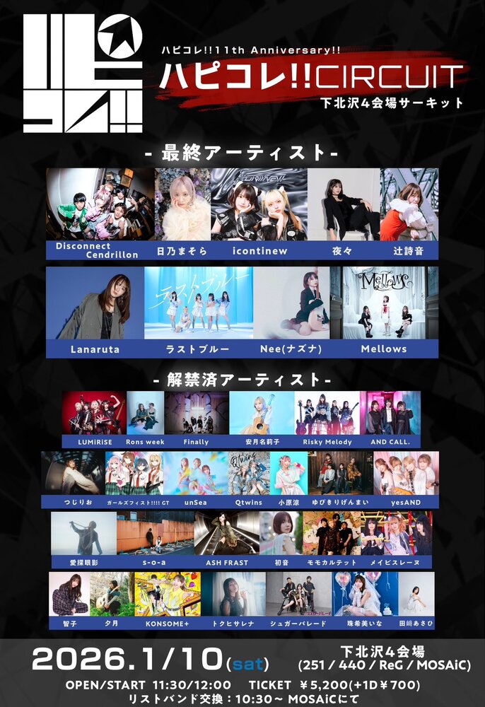 ハピコレ!!11th Anniversary!! 『ハピコレ!! CIRCUIT』 SCHEDULE 2026/01/10(土) CLUB251 ¥5,200/¥5,700(1D) チケットリンク URLをコピーする 報告する